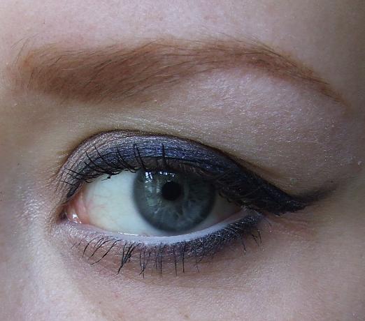Bleeeeegh, brown work shirt and lovely roots! Anyway, I used my Sleek Original and Sunset Palettes, Barry M Dazzle Dust in StormCloud (limited, I think, it was part of a set) Urban Decay 24/7 liner in Zero, Barry M white kohl pencil which is crap and Loreal Telescopic.