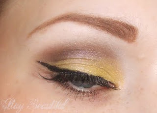 Sigh. This looks better in real life, but not that much. It was one of those ones where I kind of gave up half way through – I wanted to re-create to pattern on her bottom (tee hee) but the formula of the liners was too thick and it was gunking up my lashes…. Ah well. I know what I would have done if I were to do it again… a pink lid, like hers, and yellow and purple brows.